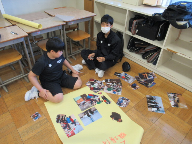 掲示物の制作では、各自が作成した作品をひとつにまとめる作業に入りました。細部にまでこだわり、より素晴らしい掲示物を作り上げています。