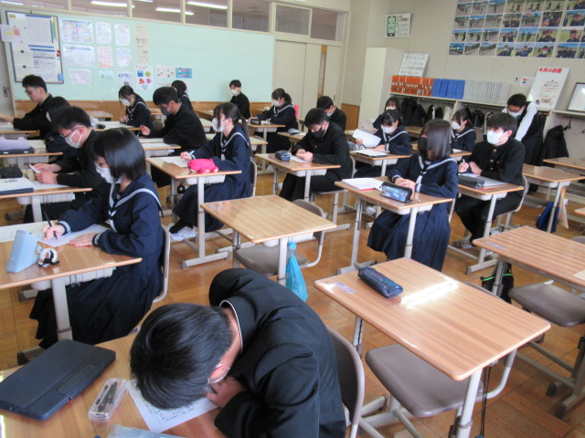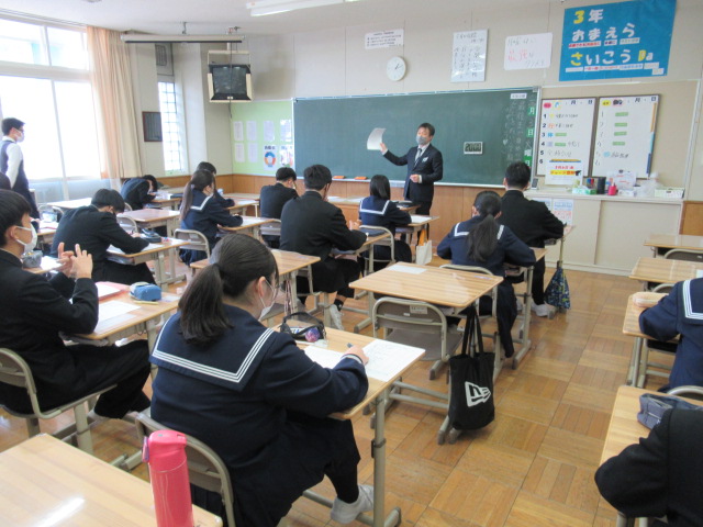 3月3日(火)、今年のひな祭りは、公立高校入試前日となりました。3年生の教室では、受験に際しての最終打ち合わせが行われました。真剣な眼差しで先生の説明に耳を傾ける生徒たちの姿には、この義務教育9年間で培ってきた知力と、大きく成長した精神的なたくましさが溢れていました。