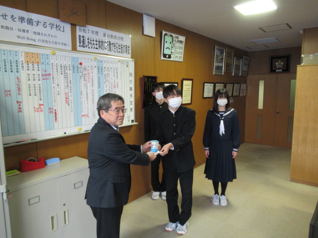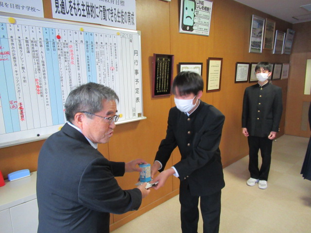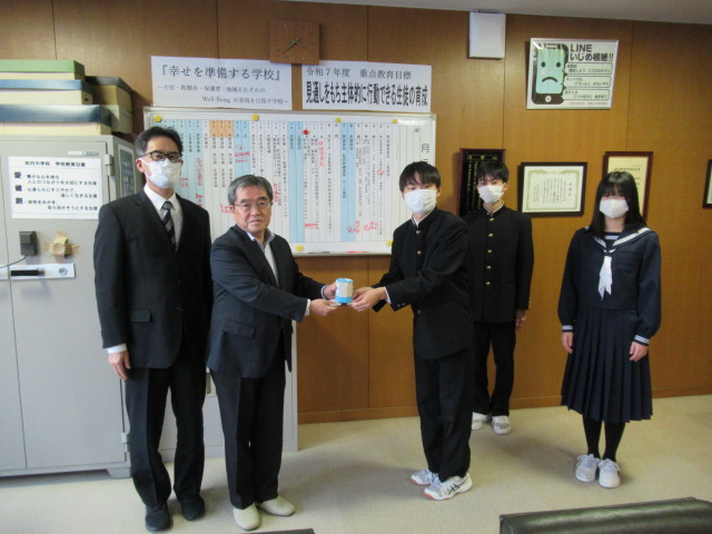 12月12日(金)、生徒会が中心となって呼びかけ、集めた「赤い羽根共同募金」を知内町社会福祉協議会 事務局長様へお渡しすることができました。