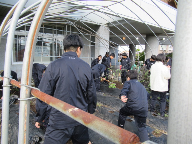 11月に入り、本格的な冬の到来を感じさせる冷え込みとなってまいりました。 そんな中、11月4日(火)に、2年生が技術家庭科実習の一環として運営してきた学校菜園の「畑仕舞い」を実施しました。