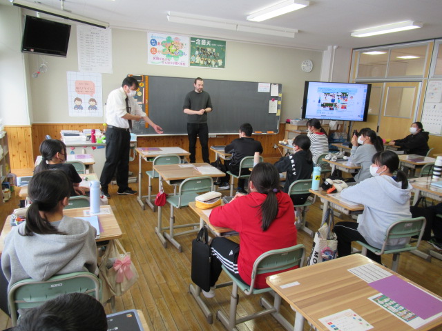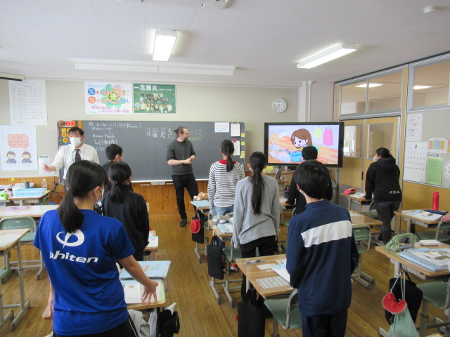 2月13日(金)、知内小学校の6年生の教室をお借りして、本校英語教諭とALTによる「英語乗り入れ授業」を行いました。この取り組みは、4月に中学校への入学を控えた6年生が、中学校の学習環境にスムーズに移行することを目的とした幼小中高一貫教育の一環です。