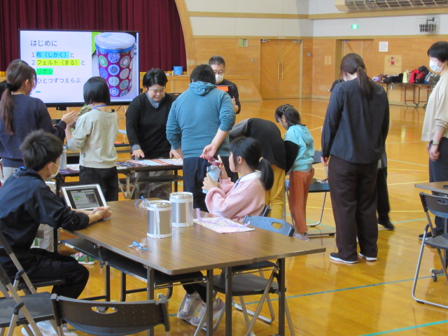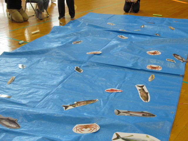 魚釣りゲームでは会場には、海に見立てた大きなブルーシートが登場!児童生徒たちは、大きなタイやカジカといった大物を釣り上げる対決に熱中し、大いに盛り上がりました。釣り上げた魚と交換できる景品も好評で、子どもたちの笑顔が弾けました。
