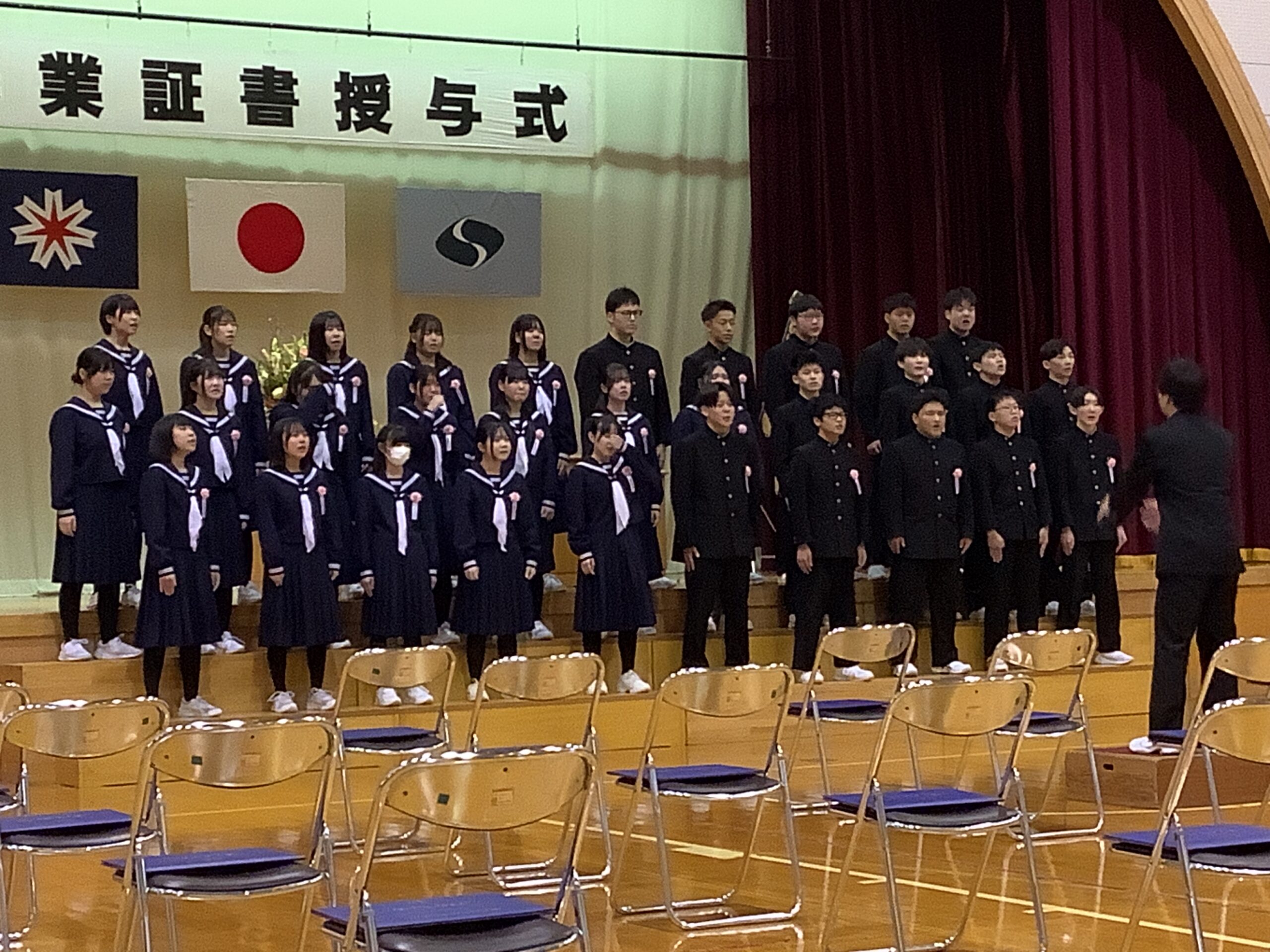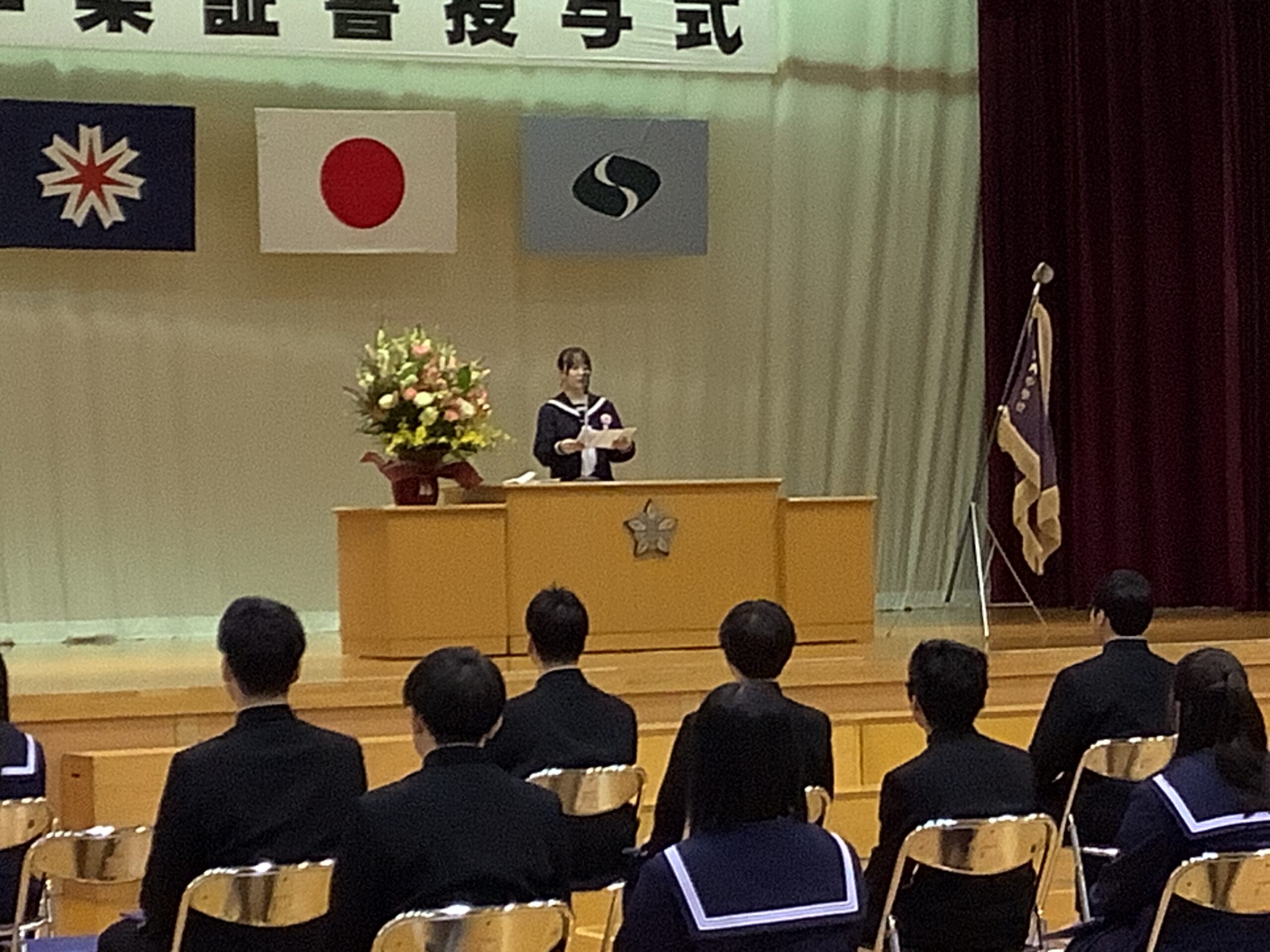 何よりも喜ばしいことに、本日は卒業生全員が揃ってこの日を迎えることができました。 呼名に対する一人ひとりの凛とした返事、そして一歩一歩踏みしめるように壇上へ上がる姿。校長より手渡される卒業証書をしっかりと見つめるその瞳には、これまでの数々の思い出と、未来への強い決意が宿っていました。