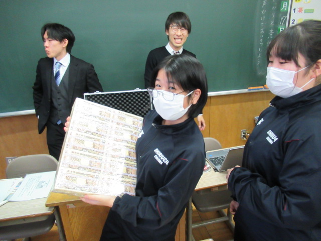 また、1億円の模擬紙幣の束(重さ約10kg)を実際に手に取る体験もあり、お金の重みと価値を実感しました。生徒たちは、社会の一員として自立するために不可欠な「お金」や「財政」の知識を、真剣な態度で深く学んでいました。