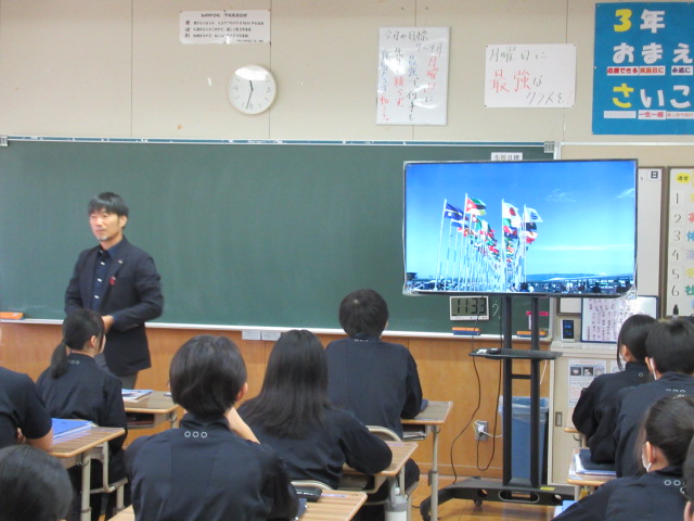 10月14日(火)、知内小学校の中島教諭を講師にお迎えし、中学3年生を対象とした国際理解に係る授業が行われました。