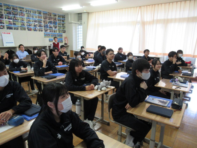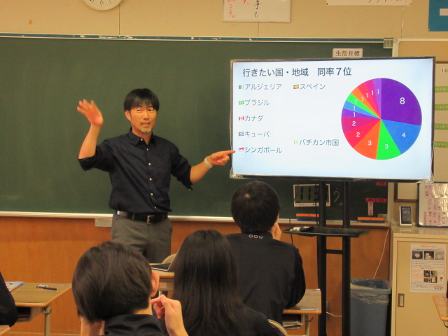 中島講師の豊かな渡航経験をもとに、世界中の文化や魅力について分かりやすく伝えていただき、生徒たちは熱心に耳を傾けていました。授業を通して、生徒たちは「外国に行ってみたい」という思いを強く持ち、大きく視野を広げたようです。