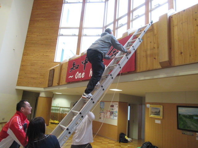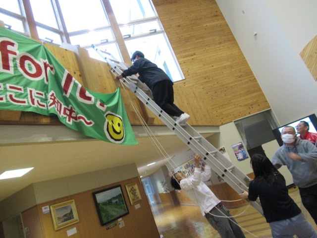 知内中学校の生徒全員が、互いに励まし合い、新しいことに積極的に挑戦し、笑顔(にこにこ)あふれる学校生活を送っていこう!という生徒会役員の熱い願いが込められています。作業にあたっていただいた生徒、職員の皆さん、ありがとうございました。このテーマのもと、全校生徒で素晴らしい1年間を過ごしていきましょう!